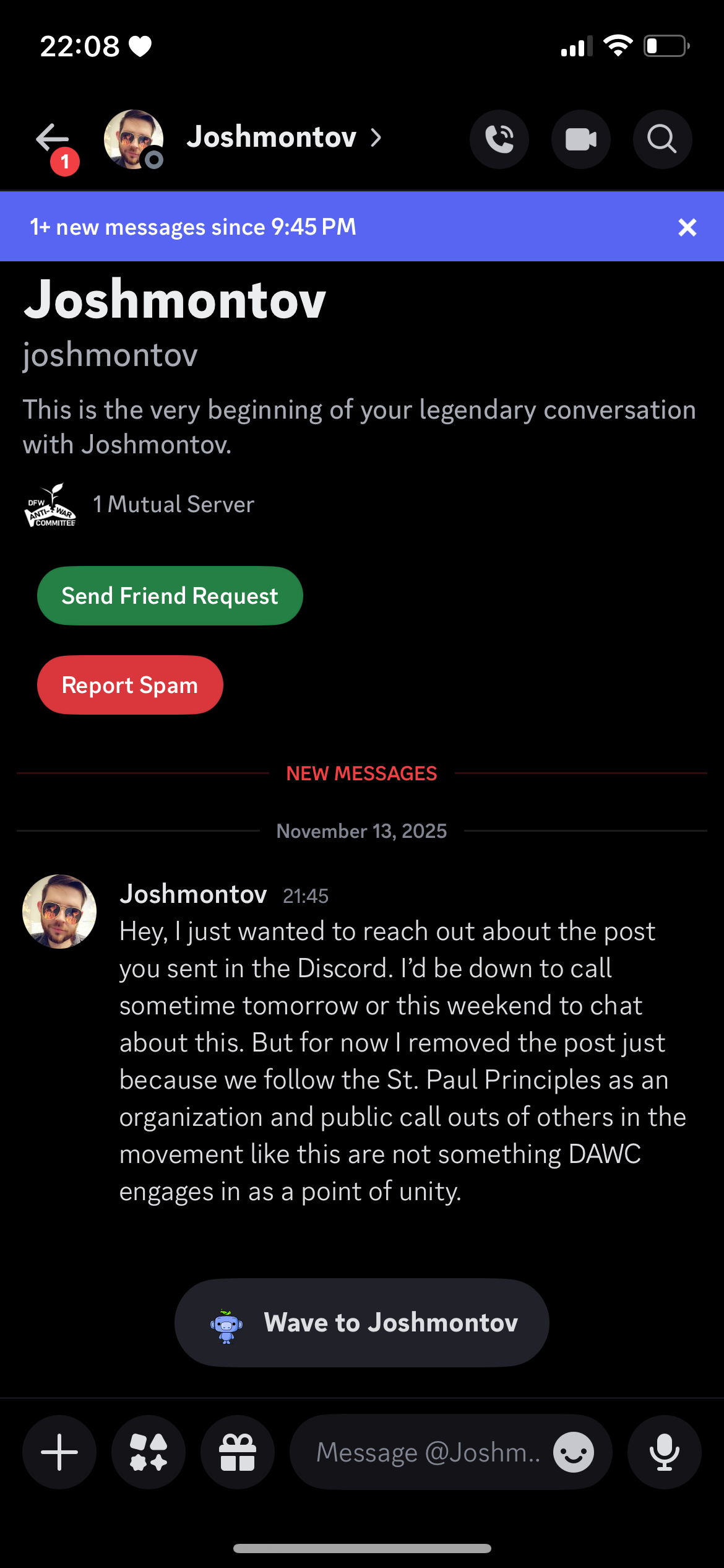 Hey, I just wanted to reach out about the post you sent in the Discord. I’d be down to call sometime tomorrow or this weekend to chat about this. But for now I removed the post just because we follow the St. Paul Principles as an organization and public call outs of others in the movement like this are not something DAWC engages in as a point of unity.