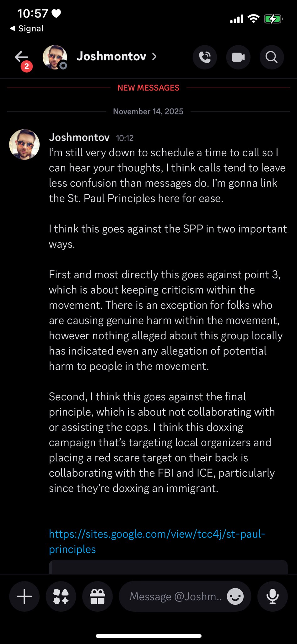 Second, I think this goes against the final principle, which is about not collaborating with or assisting the cops. I think this doxing campaign that’s targeting local organizers and placing a red scare target on their back is collaborating with the FBI and ICE, particularly since they’re doxing an immigrant.